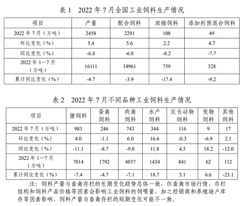 2022年1—7月,全國(guó)工業(yè)飼料總產(chǎn)量16111萬(wàn)噸,同比下降4.7%。其中,豬、蛋禽、肉禽飼料產(chǎn)量分別為7014萬(wàn)噸、1792萬(wàn)噸、4857萬(wàn)噸,同比分別下降7.4%、4.7%、7.1%;水產(chǎn)、反芻動(dòng)物飼料產(chǎn)量分別為1434萬(wàn)噸、841萬(wàn)噸,同比分別增長(zhǎng)18.7%、3.1%。